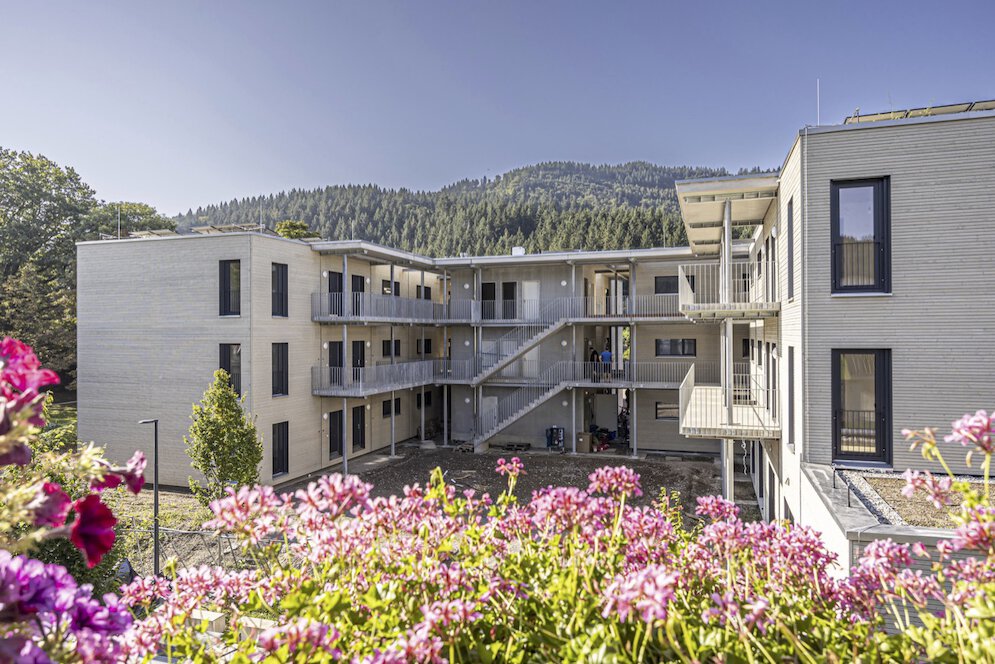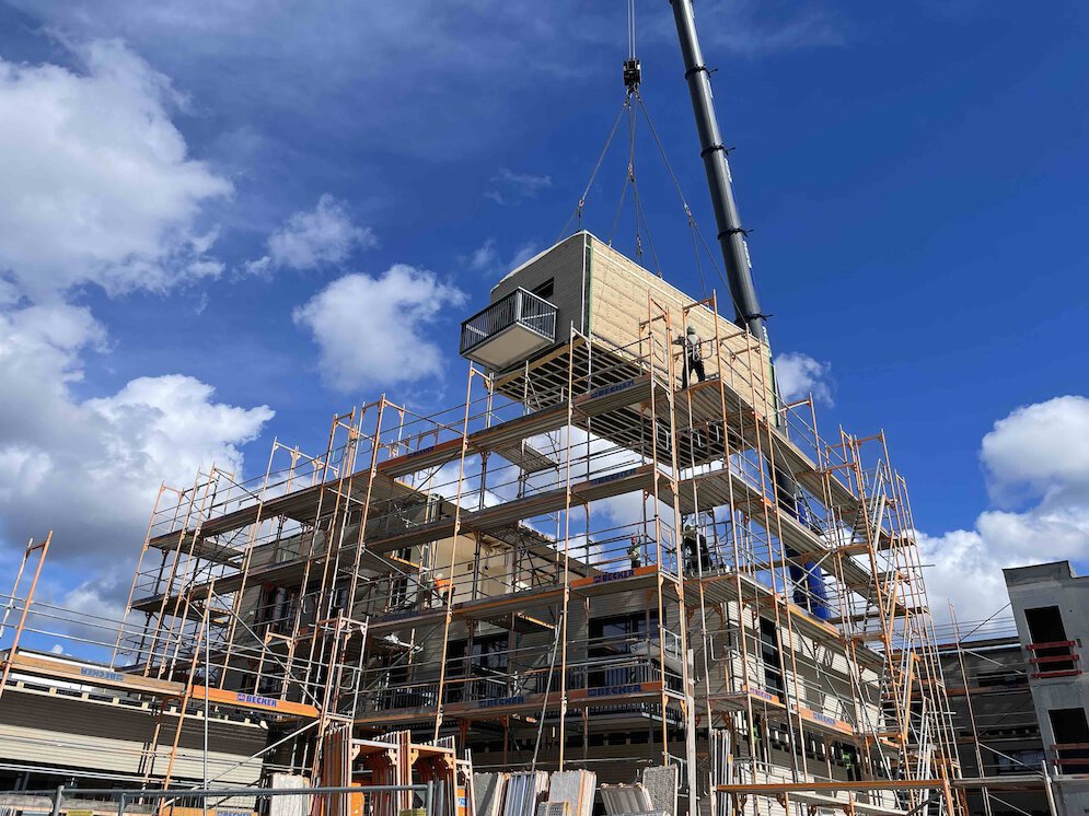 Inhalb von 3 Wochen wurden im März 2024 die 55 Holzmodule (4 Häuser) für das Wohnungsbauprojekt Bergäcker der Freiburger Stadtbau gesetzt. Mittlerweile sind nach der Endausbauphase die insgesamt 33 Wohnungen und die gemeinschaftlich genutzten Räume bezogen.