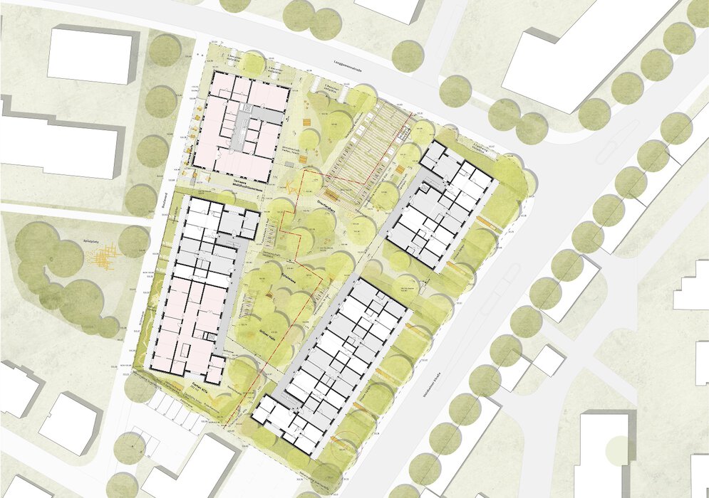 Zusätzlich zu den 89 Wohnungen werden auch 2 Clusterwohnungen, eine Kita und ein Café geplant. Für alle Bewohnerinnen und Bewohner werden ein Mehrzweckraum, eine Werkstatt und ein Raum für Co-Working konzipiert.