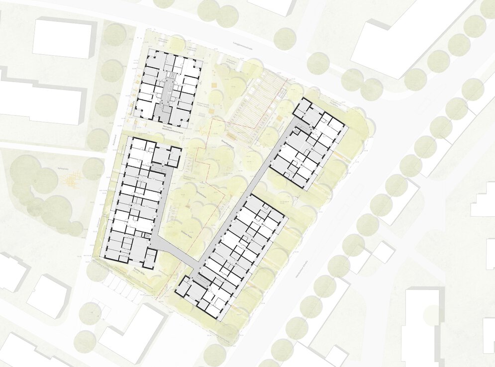 Die neue Überbauung übersetzt die Wertevorstellung der zukünftigen Bewohnerinnen und Bewohner in ein anspruchvolles bauliches Gesamtkonzept und formuliert gleichzeitig einen Ort der Begegnung über die Parzellengrenzen hinaus. Die Vernetzung von Innen- und Aussenraum, sowie der Zugang zu gemeinschaftlichen Freiflächen unter Einhaltung der Privatheit sind dabei elementare Themen der Konzeption.